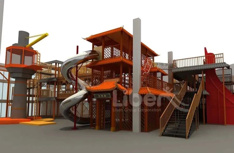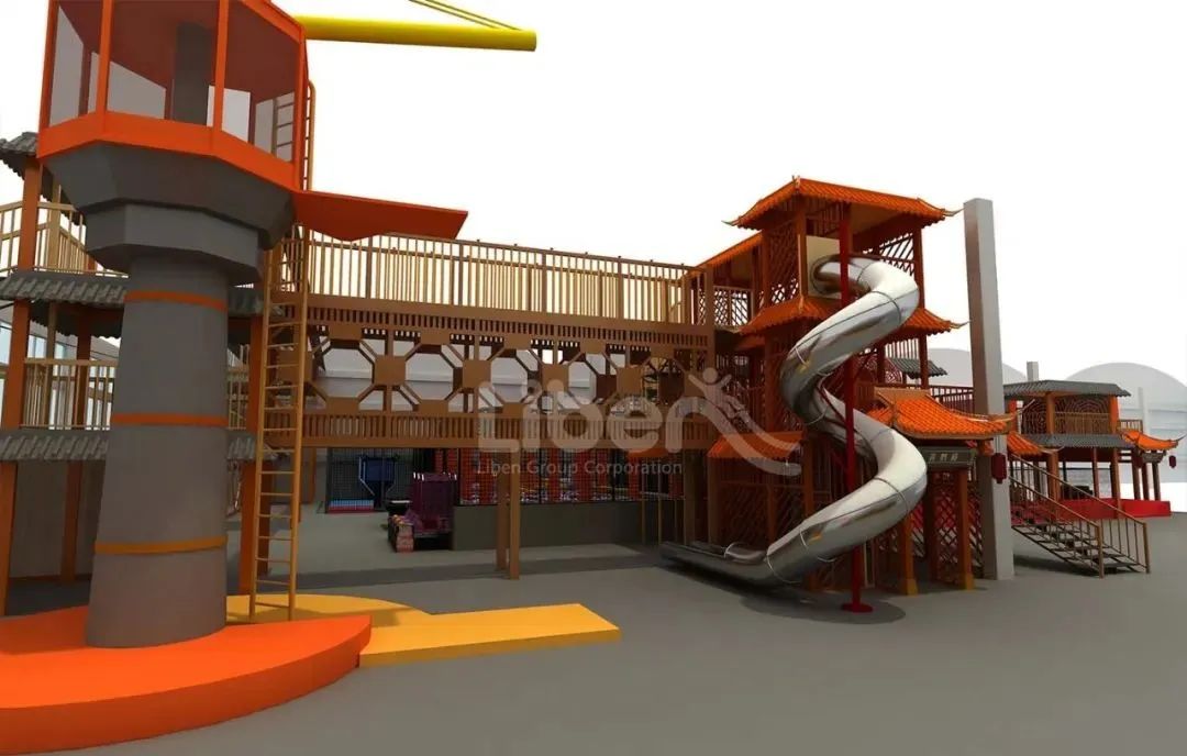 立本設(shè)計團隊以武漢當(dāng)?shù)氐娘L(fēng)土人情/建筑風(fēng)格為靈感來源,打造了頗具地域文化的樓宇風(fēng)格場館,一條不銹鋼滑梯帶你領(lǐng)略場館從上而下帶來的快感,左邊是以長江大橋為原型的木質(zhì)長廊,連接著以龜山電視塔為原型的立體攀爬區(qū)。